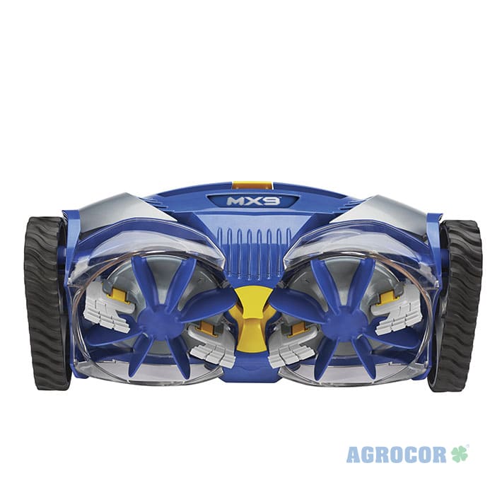 El limpiafondos MX9 cuenta con el sistema de turbo aspiración: Una potente turbina de aspiración y dos hélices de succión con cepillos que dirigen la suciedad y los residuos hacia la boca del limpiafondos que garantizan una limpieza ultra eficaz, incluso con un caudal bajo.