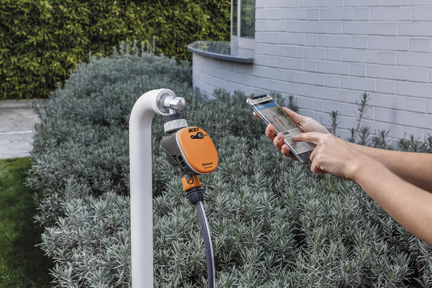El programador de riego GFPRO Eco Watering Programador de riego por computadora controlado a través de la aplicación GF, para administrar el riego del hogar directamente desde su teléfono móvil. Es muy fácil de usar y permite programar el riego conectando el dispositivo al programador a través de la conexión de tecnología Bluetooth.
